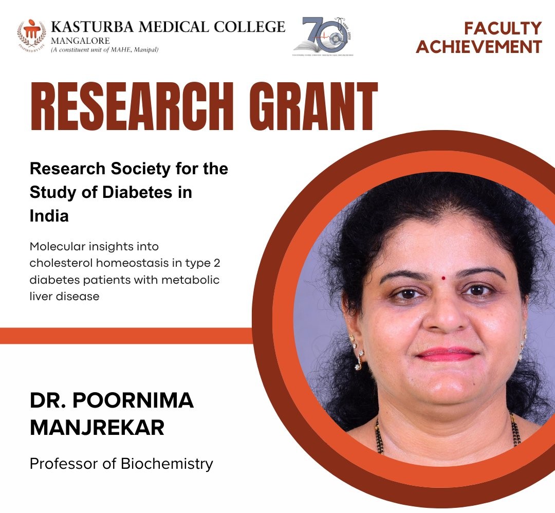 Congratulations to Dr. Poornima Manjrekar, Professor, Department of Biochemistry, KMC Mangalore, for securing a research grant from the Research Society for the Study of Diabetes in India