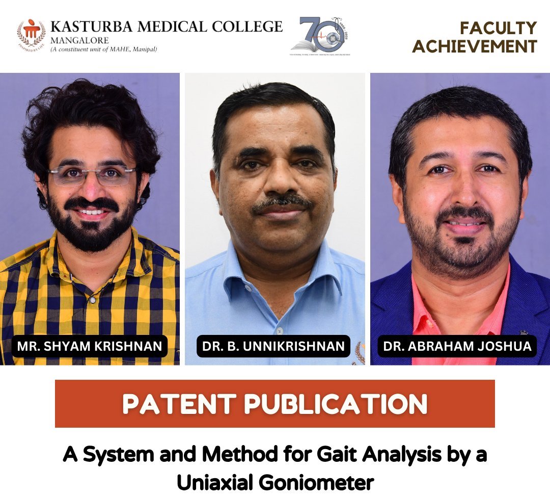 Congratulations to Mr. Shyam Krishnan (Assistant Professor of Physiotherapy), Dr. B. Unnikrishnan (Dean and Professor of Community Medicine), and Dr. Abraham M. Joshua (Additional Professor of Physiotherapy) at Kasturba Medical College, Mangalore, for the publication of their patent titled "A System and Method for Gait Analysis by a Uniaxial Goniometer" by the Indian Patent Office.