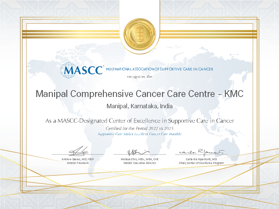 The Kasturba Medical College, Manipal is the first centre in Asia to receive this accreditation. The accreditation was possible due to excellent supportive care treatment offered to patients receiving active cancer-directed therapies. All patients receiving radiotherapy are reviewed in the outpatient clinic weekly for assessment, documentation, and management of radiotherapy related toxicities. All patients on chemotherapy are scheduled for a mid-cycle evaluation of toxicities. Our cancer centre has an integrated palliative care program where patients receiving cancer-directed therapies and experiencing toxicities are effectively managed for symptom relief, psychosocial needs, family support, and determination of allied health support. Patients presenting with severe toxicities after hours are assessed in the hospital emergency medicine department who will coordinate with the on-call speciality residents from the cancer department.