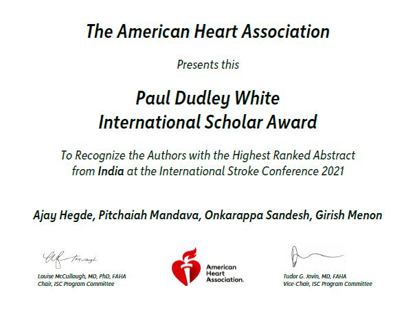 10) Dr Ajay Hegde, Dr Pitchaiah Mandava, Dr Onkarappa Sandesh, Dr Girish Menon received Paul Dudley White International Scholar Award presented by The American Heart Association (To Recognize the Authors with the Highest Ranked Abstract from India), International Stroke Conference 2021, held in April 2021.