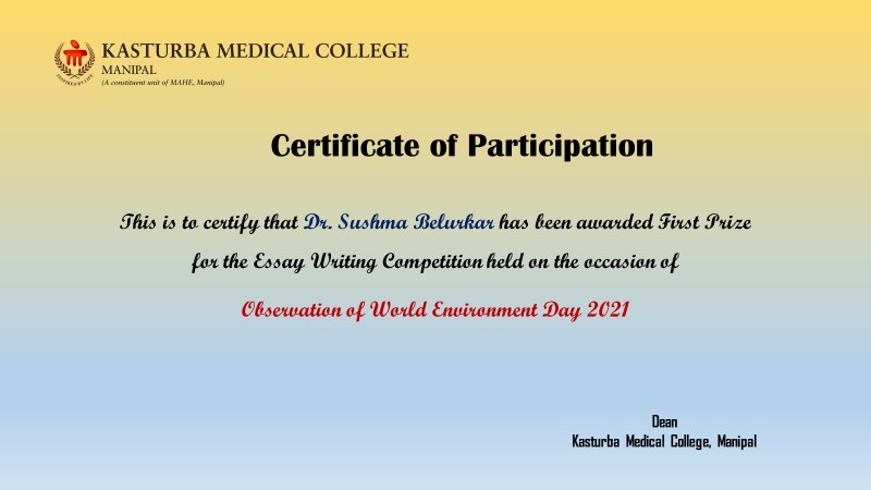 13) Dr. Sushma Belurkar (Pathology) awarded 1st prize for Essay writing competition held on the occasion of World Environment Day 2021.