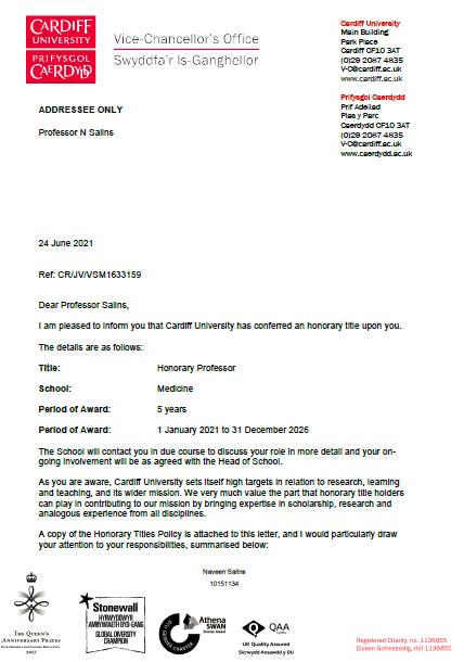 17) Dr. Naveen Salins (Palliative Medicine & Supportive Care) ‘Honorary Professor’ title by Cardiff University from 1 January 2021 to 31 December 2026.