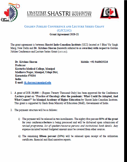 23) Dr. Krishna Sharan received a grant of Rs. 20,000/- by Shastri Indo-Canadian Institute