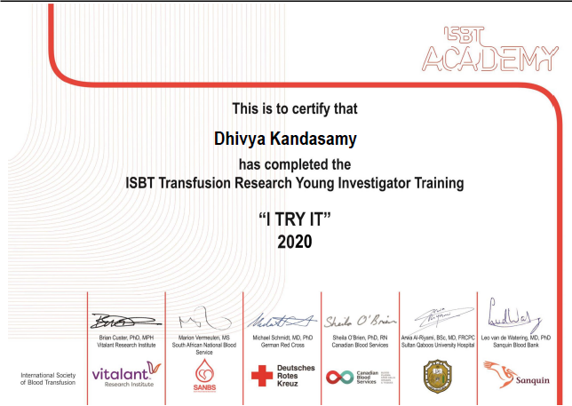 3) Dr Dhivya Kandasamy (Immunohematology and Blood Transfusion) received certificate for ‘I TRY IT 2020’, underwent Young investigator research training (6 weeks course).