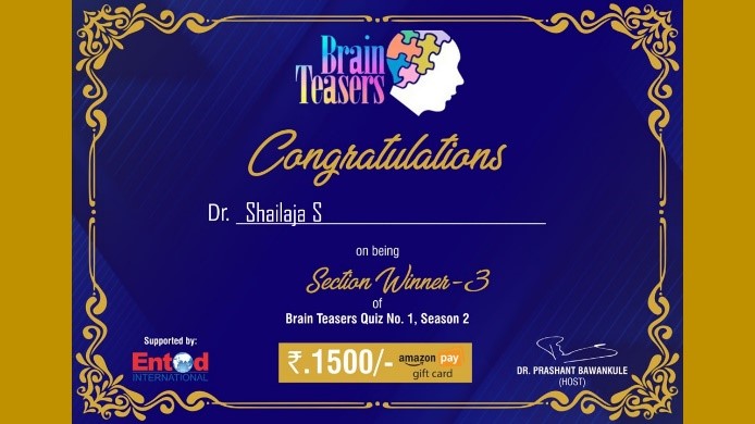 5) Dr. Shailaja S (Ophthalmology) 3rd winner of Brain Teasers Quiz No. 1, held on 15 February 2021. (ENTOD supported Brain Teasers Quiz! Rs. 1,500/-)