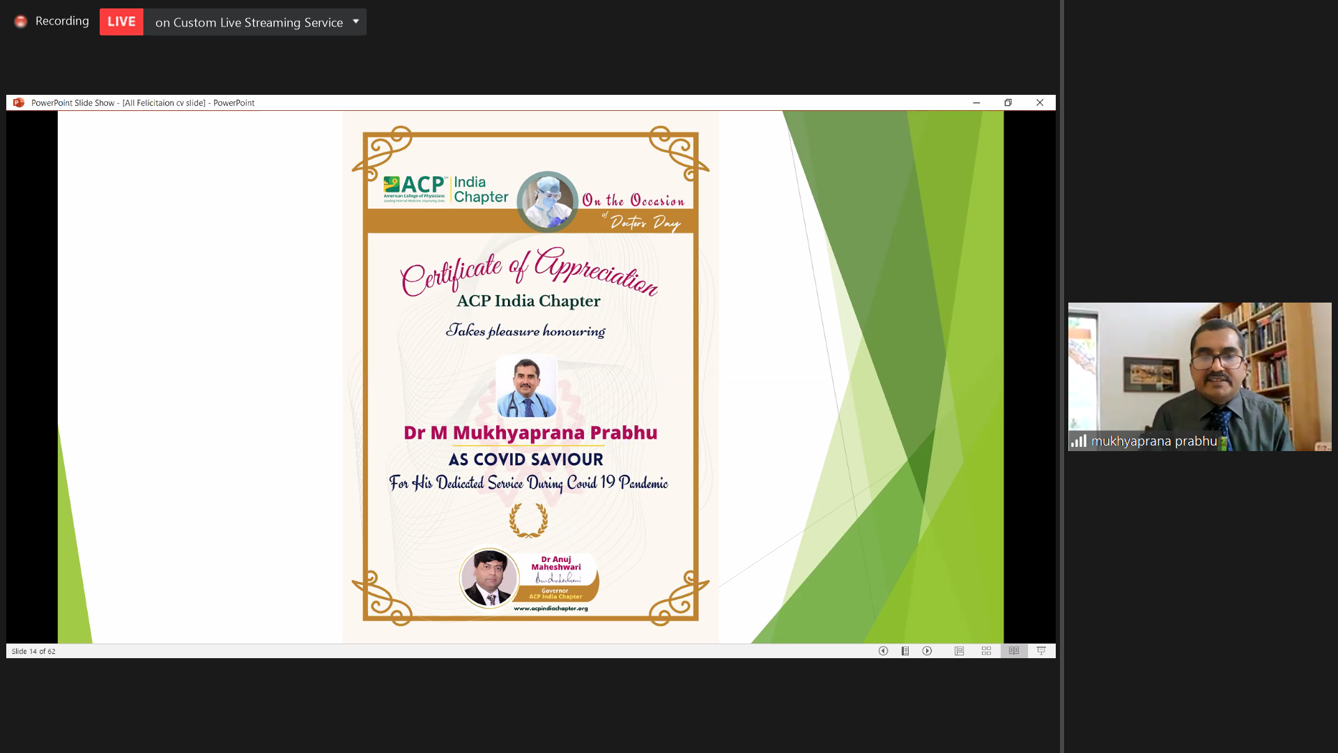 16) Dr M Mukhyaprana Prabhu (Medicine) being felicitated by American College of Physicians, India Chapter on occasion of Doctor’s Day Celebration as ‘Corona Saviour’.