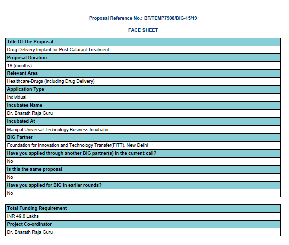 2) The Department of Ophthalmology received BIG BIRAC grant (50 lakhs) along with the department of biotechnology MIT Manipal, for Nano particle drug delivery implant after cataract surgery.