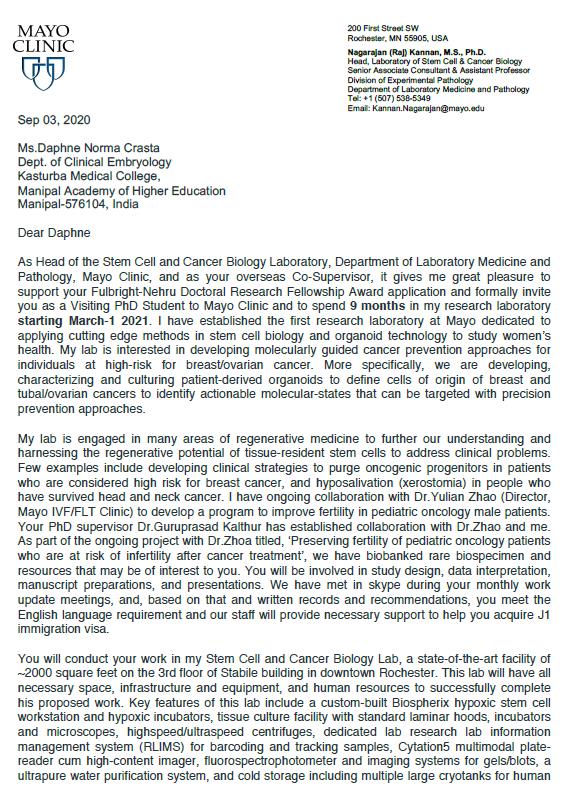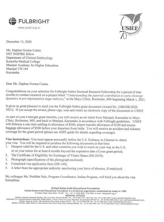18) Ms. Daphne N Crasta (PhD Scholar – Clinical Embryology) awarded prestigious ‘Fullbright Nehru Doctoral Research’ Fellowship to research on paternal factors on early embryo cleavage dynamics at Mayo Clinic, Rochester, USA.