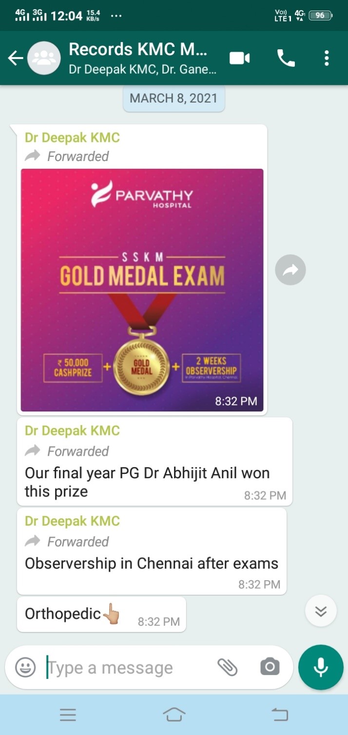 19) Dr Abhijit Anil won Gold medal exam at Parvathy Hospital in Chennai during observership.