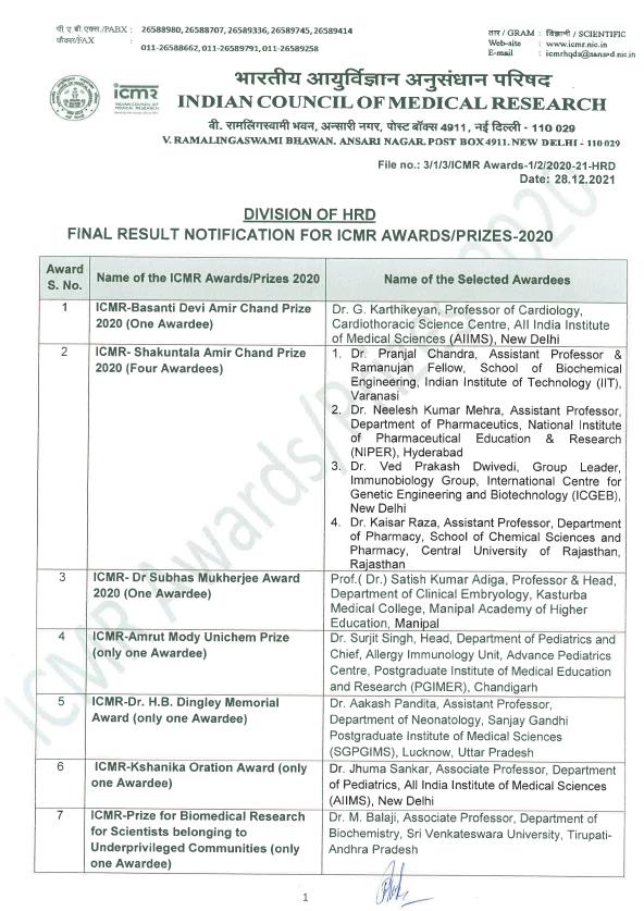 42) Dr Satish Kumar Adiga (Reproductive Science) received Dr Subhas Mukarjee award 2020; 28.12.2021 (National).