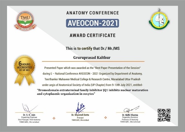 27) Dr Guruprasad Kalthur (Clinical Embryology) won Best paper presentation, AVEOCON 2021 (International), 9th - 10th July 2021.