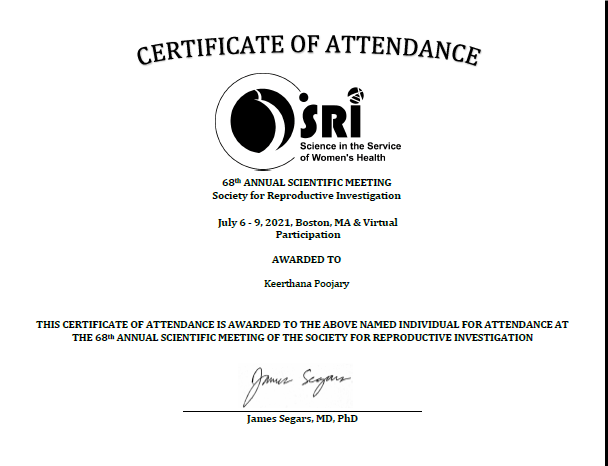 28) Ms Keerthana Poojary (Clinical Embryology) received Kusum Lata travel award to attend 68th Annual meeting of Society of Reproductive investigation (National), May 17, 2021.