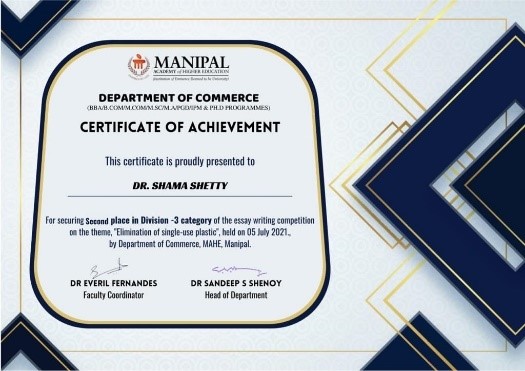 29) Dr. Shama Shetty (ENT) won 2nd place in Essay writing competition “Elimation of single use of plastic” conducted by Dept. of Commerce, MAHE, Manipal, 05-07-2021.