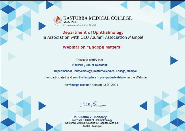 33) Dr. Nikhil G (MS Ophthalmology), 1st Place in PG Debate: Topic - Burn or Inject –PRP v/s Anti VEGF for PDR, Endoph Matters Webinar, Sep-21