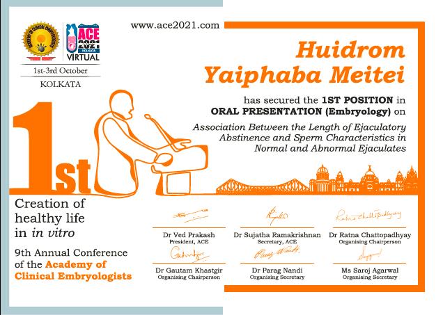34) Huidrom Yaiphaba Meitei, PhD Scholar (Department of Reproductive Science) First prize in conference presentation (Oral), 9th Annual conference of the Academy of Clinical Embryologists 1-3, October 2021 (National)