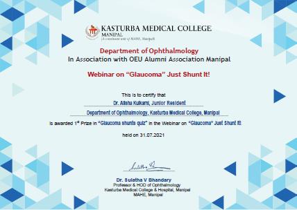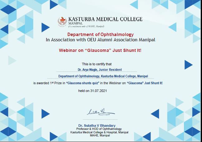28) Dr. Arya Wagle & Dr. Alisha Kulkarni (MS Ophthalmology) first Prize (shared) Intercollegiate PG Quiz , Webinar on “Glaucoma” Just Shunt It! (International).