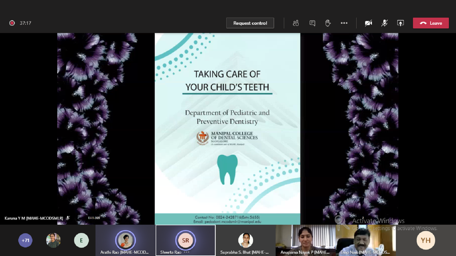 On the occasion of Children’s Day which is also celebrated as Pedodontist’s Day in India, as a part of community engagements for building stronger communities, a patient education booklet titled “ Taking Care of Your Child’s Teeth” was released by Dr. Dilip G Naik, Pro Vice Chancellor, MAHE (Mangalore Campus). Dr. Ashita Uppoor, Dean, MCODS, Mangalore and Dr. Premalatha Rai, Associate Dean, graced the occasion. A Panel Discussion on career options after post-graduation in Pediatric Dentistry titled, “Post-Graduation in Pediatric Dentistry: When, Why, How”, was moderated by Dr. Ashwin Rao, Associate Professor, Department of Pediatric and Preventive Dentistry. Dr. Shanti Swarup, Dr. Vidya Chandran, and Dr. Shweta Rao, Post graduate Alumni of the Department of Pediatric and Preventive Dentistry, enlightened the under graduate students regarding scope of Pediatric Dentistry. The program was well appreciated and attended by 108 participants.