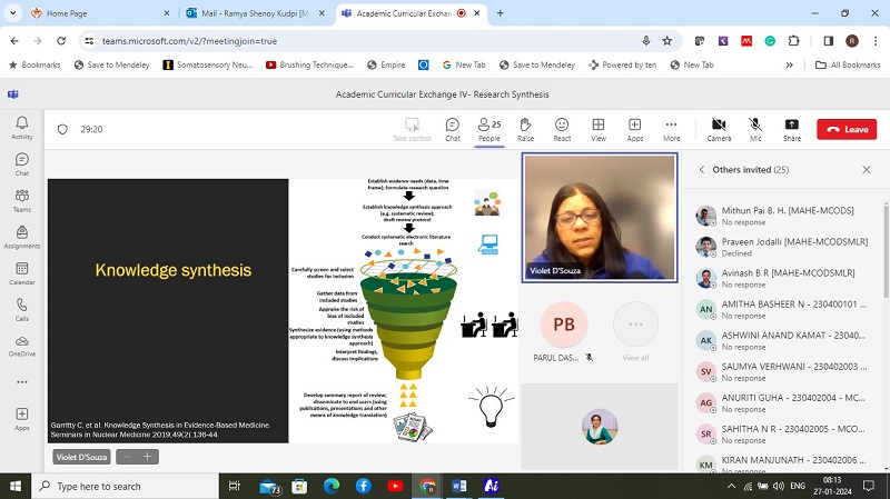 This workshop on "Research Synthesis" was fourth in the series of Academic Curricular Exchange programs (ACE-IV) and was held on the 27th of January 2024. The event aimed to equip participants with the necessary skills and knowledge to effectively understand the need as well as application of various research synthesis methods employed in research during today’s time. This Academic Curricular Exchange was organized together by the Department of Public Health Dentistry, MCODS Mangalore and Post Graduate Research Vertical, MCODS< Mangalore.