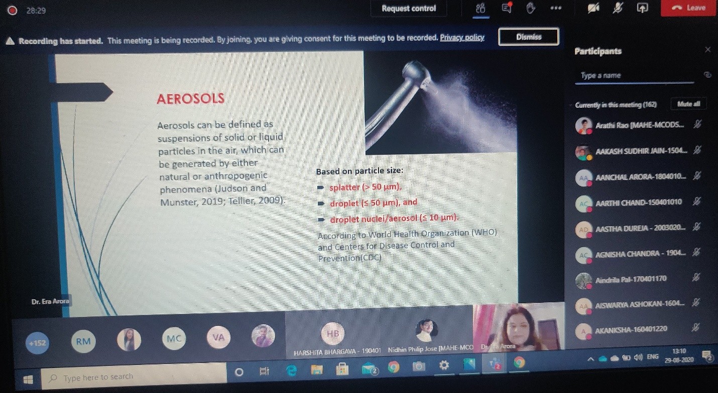 The webinar had 173 participants, which included alumni, current students and external audience. Dr. Era spoke on very relevant and clinically important topic of managing dental caries in the covid era. She also shared several practical tips. The talk was highly appreciated and was a very good learning experience for all.