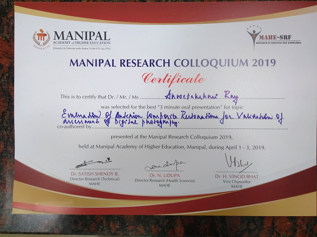 Dr.Anwetakshmi Ray, 2nd year P.G, Dept. of Conservative Dentistry & Endodontics, had participated in Manipal Colloquium,2019 held on 3rd April. Her short study titled “Evaluation of anterior composite restorations for validation of assessment of digital photography.” was selected for best 3 minute oral presentation and was amongst the top 5 out of 300 entries.