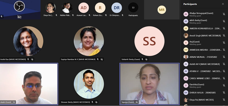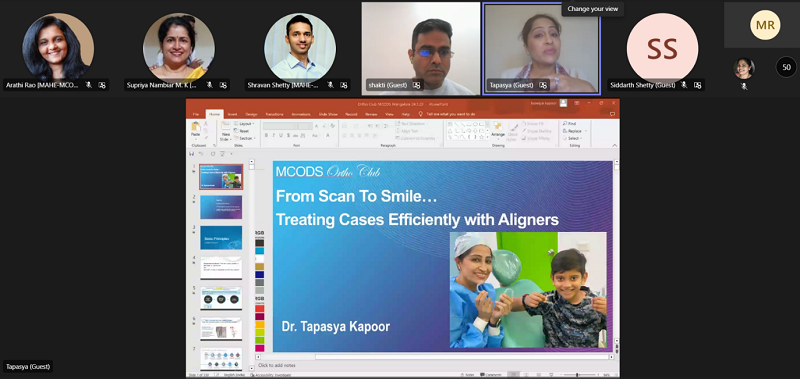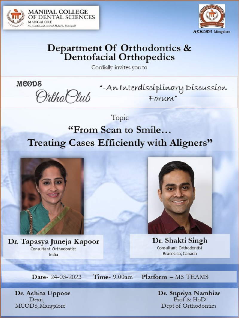 The Department of Orthodontics and Dentofacial Orthopedics, MCODS, Mangalore successfully conducted the first webinar session of 2023 of the OrthoClub series on March 24th via the MS Teams platform. The topic of discussion was “From Scan to Smile: Treating cases efficiently with alignersThe resource persons for the session were two of our esteemed alumni - Dr. Tapasya Juneja Kapoor, Consultant Orthodontist, India, and Dr. Shakti Singh, Consultant Orthodontist, Canada ; renowned clinicians and academicians with several years of experience. The inaugural program welcome was provided by Dr Arathi Rao, Alumni co-ordinator, MCODS, Mangalore and was moderated by Dr.Nidhin Philip and Dr. Asavari Desai, Associate Professors, Dept of Orthodontics, MCODS, Mangalore. The webinar focused on case selection for aligners and biomechanics involved to achieve the best possible treatment outcome. The resource persons also showcased a number of successfully treated cases with varying complexity. Each session was followed by an interactive discussion between the participants and the resource person. The speakers shared with us their valuable insights and suggestions for a better outcome of the treatment. The program was highly appreciated and was a very good learning experience for all. It was attended by over 60 participants including postgraduates of various disciplines and some of our esteemed alumni.