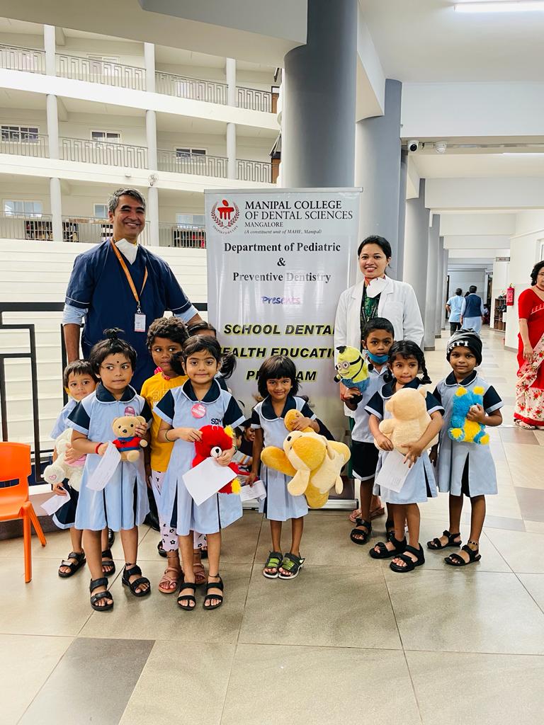 On 18th July 2022 , Kasturba Medical College, Mangalore initiated the ‘Teddy Bear Clinic’ School program in collaboration with the Department of Pediatric and Preventive Dentistry, Manipal College of Dental Sciences, Mangalore. This program was conducted for pre-school children with teachers of SDM School, Ashoknagar, Mangalore. It was conducted to spread the awareness of preventive health and dental issues. The Teddy Bear Clinic Program aims to reduce the anxiety in young children who have fear of doctors, hospitals, medical and dental procedures while enhancing their knowledge of health and diseases. Around 180 children aged 5-7 years got their favourite teddies to the school. As in the hospital setting, they registered their teddy names while presenting their complaints. Doctors demonstrated the clinical examination and showed usage of common instruments that will be normally used in the clinic. 13 Interns under the guidance of Dr. Ashwin Rao and Dr. Charisma Thimmaiah were a part of the program. At the end of the session, patient education booklets “Taking Care of Your Child’s Teeth” were distributed to all the pre-school children. The programme was well appreciated by the children and schools authorities.