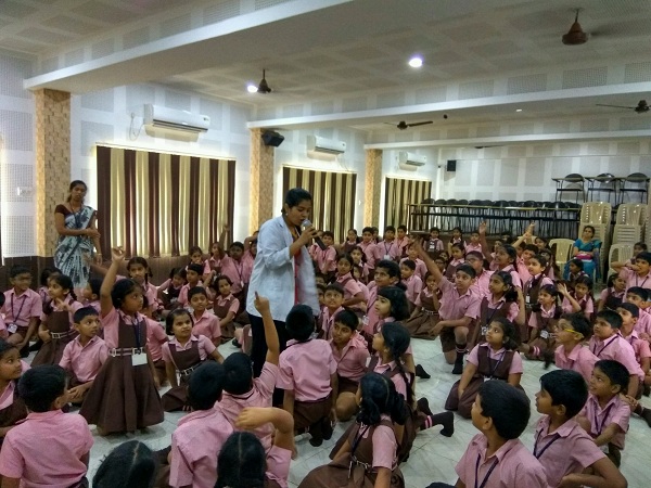 Next, a small skit was enacted by the interns. The skit took a ride back into a renowned fairy tale of Hansel and Gretel which was modified and depicted as how they end up in getting carious lesions and tooth pain and run away to MCODS and get treated by a paediatric dentist. We were overwhelmed seeing the children come up with various questions at the end of the skit. It was a matter of great pleasure for us, catering the answers to their questions.
