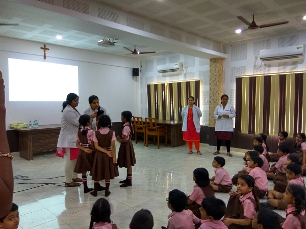 The program took place on 27th of October, 2016 at Lourdes Central School, Bejai after prior permission been taken from the Principal. A one hour session with the children of 3rd standard began at 10.30 in the morning. We were greeted with a hearty warm welcome by the teachers and the students. In the first part of the program we introduced the children to the importance of maintaining a good oral health and how we can achieve it. After that a video with a song depicting a cartoon, brushing his teeth in the right way was played and also enacted too. We could see how the children enjoyed it as they finally stepped into the stage and danced with the song.