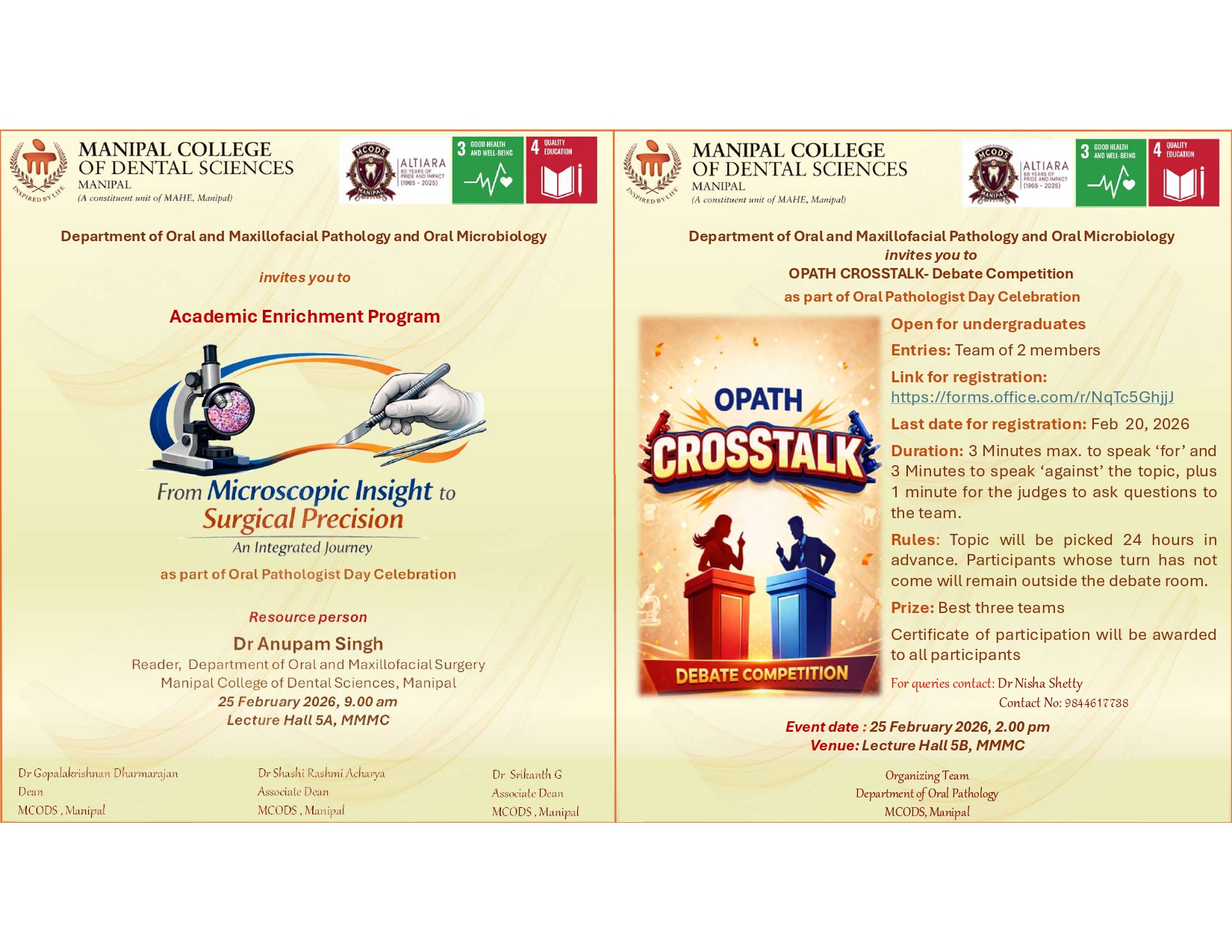 The Department of Oral and Maxillofacial Pathology and Oral Microbiology organized an Academic Enrichment Program for undergraduate students on the topic “From Microscopic Insights to Surgical Precision – An Integrated Journey” as part of Oral Pathologists Day celebration. The session commenced with inspiring opening remarks by the Dean, Dr.Gopalakrishna Dharmarajan, who emphasized the importance of integrating basic sciences with clinical practice. The occasion also served as a moment to recollect and acknowledge the valuable contributions of Dr. H. M. Dholakia to the field of Oral Pathology. The resource person of the day Dr Anupam Singh, Reader, Department of Oral and Maxillofacial Surgery, MCODS, Manipal delivered an insightful presentation highlighting the critical link between microscopic diagnosis and precise surgical management. Through relevant clinical examples, the speaker emphasized the importance of clinicopathological correlation and collaborative practice in ensuring optimal patient outcomes.