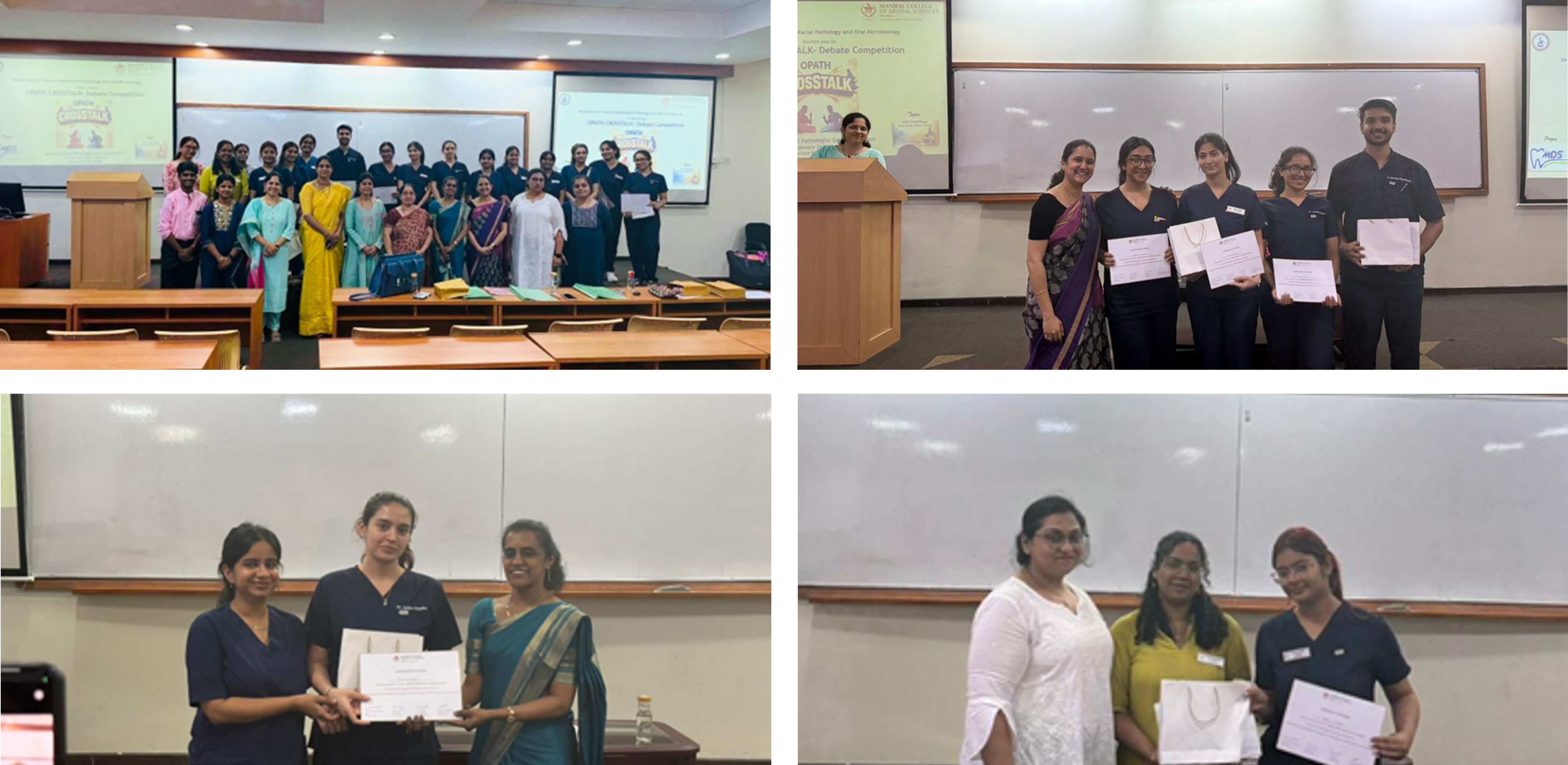 The Department of Oral and Maxillofacial Pathology and Oral Microbiology organized a debate competition on the theme “Oral Pathology: Is There Uncertainty Within Certainty?” The competition witnessed enthusiastic participation from students ranging from III BDS to Interns and proved to be truly enriching, owing to the diverse range of topics selected by the students. The variety of perspectives brought richness to the discussion, making the session dynamic and thought-provoking for everyone present, and the program successfully fostered critical thinking. The event truly reflected the spirit of National Oral Pathologists’ Day by celebrating scientific knowledge and meaningful discussion in Oral Pathology. It was truly a great learning experience, not only for the participants but also for the audience and faculty. The event was judged by Dr Monica C Solomon, Professor, Department of Oral and Maxillofacial Pathology and Oral Microbiology; Dr Sreea Roy, Reader, Department of Oral and Maxillofacial Surgery; and Dr Mathangi K, Reader, Department of Oral Medicine and Radiology.