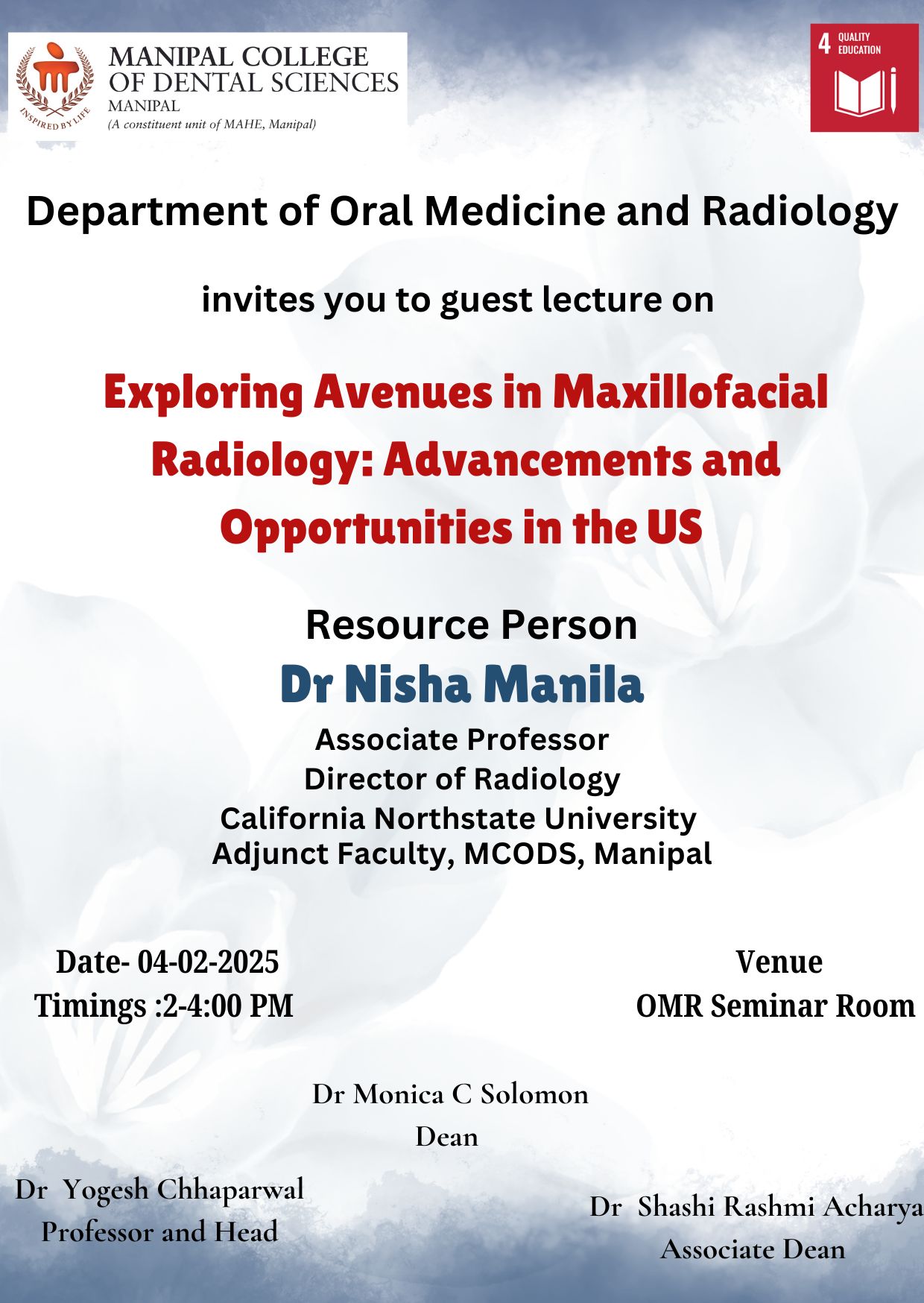 The Department of Oral Medicine and Radiology, MCODS, Manipal organized a continuing professional development program titled “Exploring Avenues in Maxillofacial Radiology: Advancements and Opportunities in the US” on 4th February 2025. Dr Nisha Manila is an Associate Professor, Director of Academic and Clinical Radiology at the California North State University College of Dental Medicine, US and an Adjunct Faculty of MCODS, Manipal. There was an interactive session for undergraduate, postgraduate students and interns with the resource person where she discussed the avenues for Dentistry career abroad. The students had a wonderful opportunity to gain insights about opportunities ahead and the program was well appreciated. Dr Monica Charlotte Solomon felicitated the resource person.