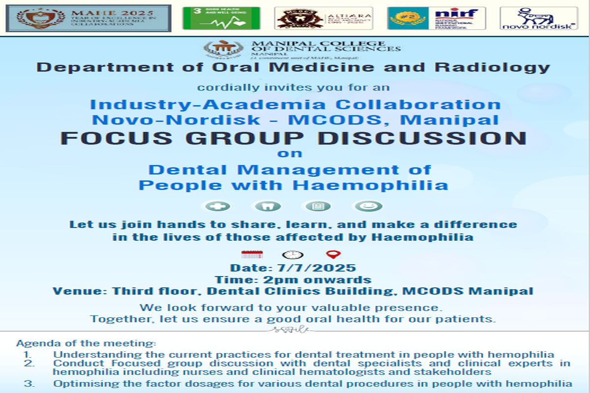 Industry Academia collaboration between MCODS, Manipal and Novo Nordisk pharmaceutical company was signed on 7th July 2025 as an initiative for Hemophilia patients seeking Dental care by Dr Mathangi Kumar with the support from Oral Medicine and Radiology, MCODS, Manipal.