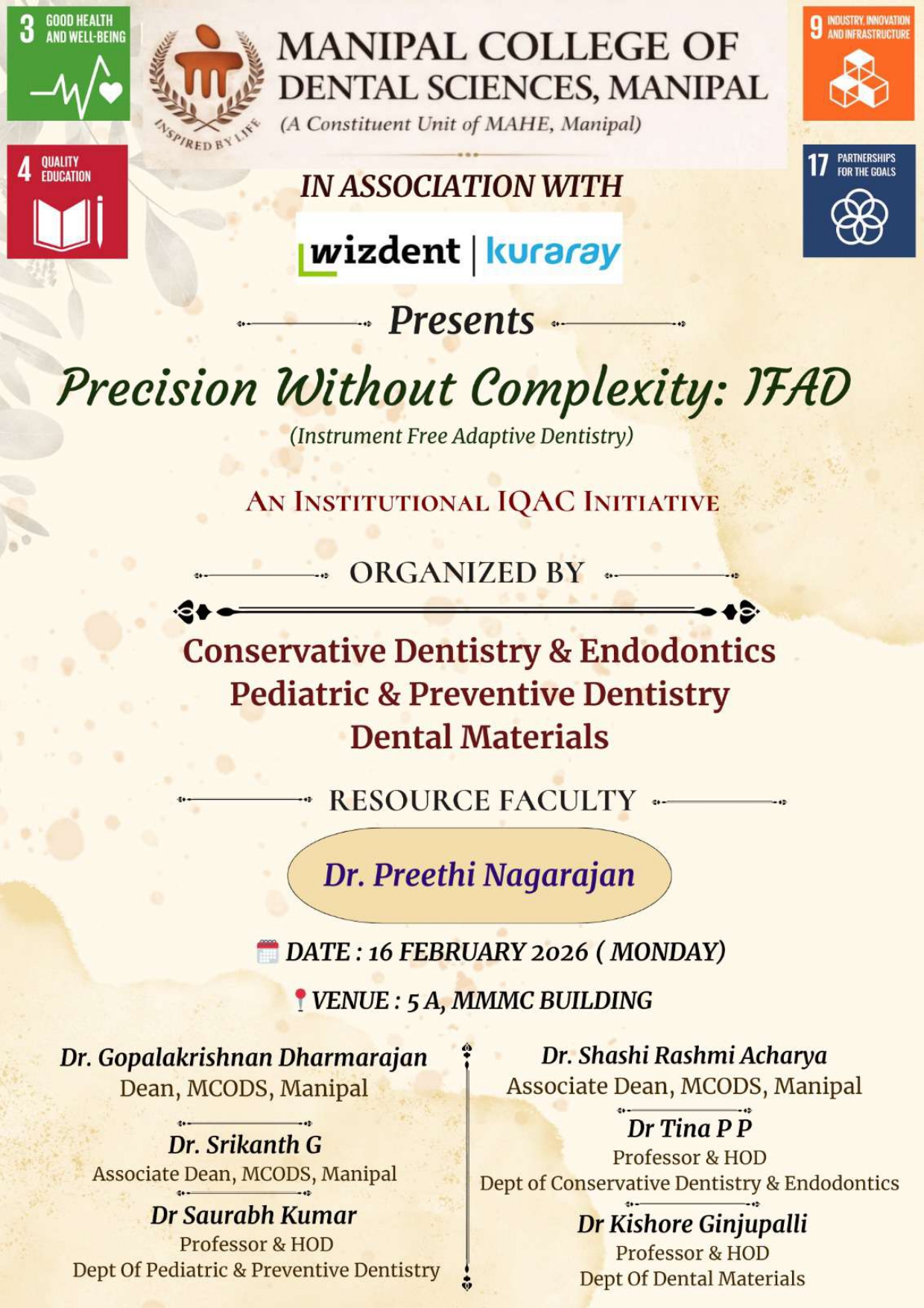 The Departments of Conservative Dentistry & Endodontics, Paediatric & Preventive Dentistry, and Dental Materials at MCODS Manipal successfully organized a Continuing Dental Education (CDE) program titled “Precision Without Complexity: IFAD (Instrument Free Adaptive Dentistry)” on 16th February 2026 at 5A, MMMC Building, as an Institutional IQAC initiative IFAD - CDE. The program, conducted in association with Wizdent and Kuraray, featured Dr. Preethi Nagarajan as the resource faculty, who delivered an insightful session highlighting the principles of Instrument Free Adaptive Dentistry with emphasis on achieving optimal restorative precision while simplifying clinical procedures. The event was graced by Dr. Shashi Rashmi Acharya and Dr. Srikanth G, Associate Deans; Dr. Tina P P, Professor & Head, Department of Conservative Dentistry & Endodontics; Dr. Kishore Ginjupalli, Professor & Head, Department of Dental Materials; and Dr. Saurabh Kumar, Professor & Head, Department of Paediatric & Preventive Dentistry, underscoring the academic significance of the initiative.