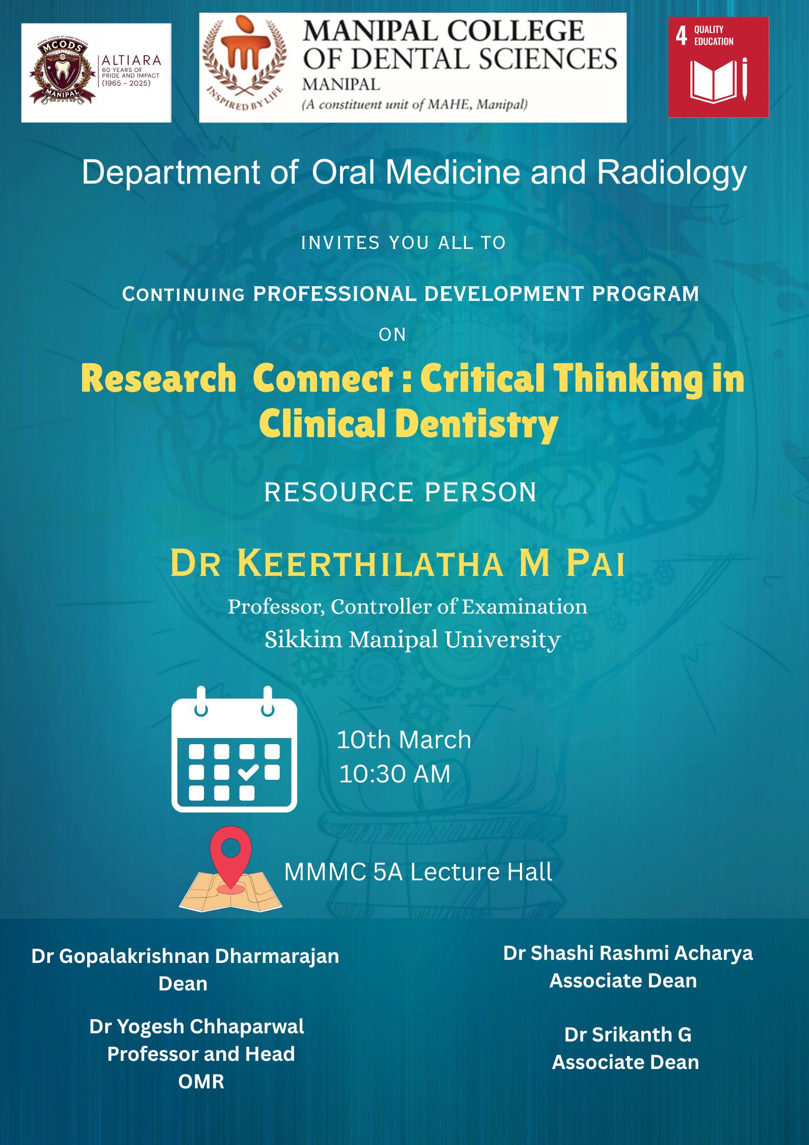 The Department of Oral Medicine and Radiology organized a Continuing Dental Education (CDE) program on 10th March 2026 titled “Research Connect: Critical Thinking in Clinical Dentistry.” The program featured Dr. Keerthilatha M. Pai, who currently serves as the Controller of Examinations at Sikkim Manipal University and as a Professor in the Department of Dentistry at the Sikkim Manipal Institute of Medical Sciences, Gangtok, as the resource person.