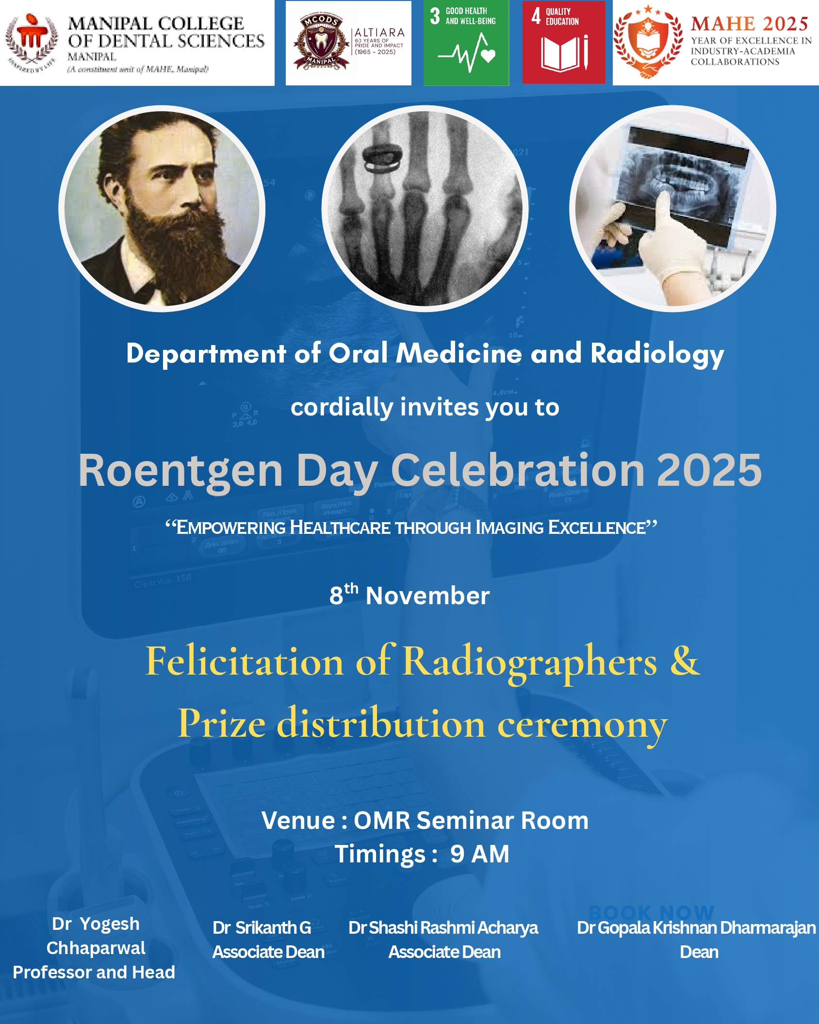 The Department of Oral Medicine and Radiology, MCODS Manipal, celebrated the International Day of Radiology on November 8, 2025, in commemoration of the discovery of X-rays. Dr. Yogesh Chhaparwal, Head of the Department, welcomed the gathering and provided an overview of the Roentgen Day celebrations and competitions that are conducted every year. This year a student painting competition titled “Spectrum of Dental Radiology,” was conducted on November 6, 2025. The competition was well received with enthusiastic participation of the undergraduate students.