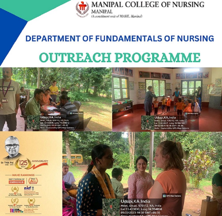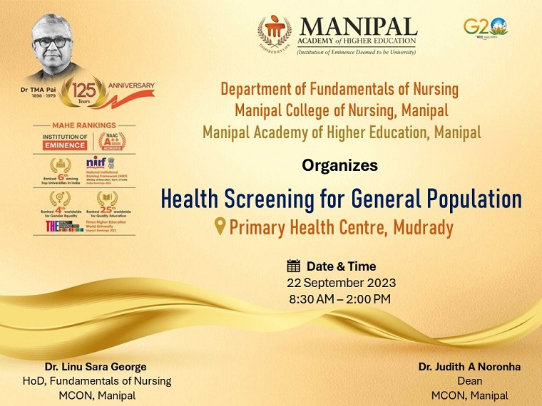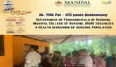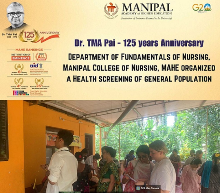 The Department of Fundamentals of Nursing organized an outreach program on "Health Screening" for the general public at Mudrady, Karkala Taluk, as part of the 125th birth anniversary of Dr. TMA Pai on 22.09.2023 9.30 am to 12.30 PM. This health screening included general health assessment (height, weight, and BP measurement) and cardiac risk assessment for the adult population. Around 40 participants benefitted from the program. The first-semester nursing students and two interns from the clinical service department also contributed to the camp activities. The faculty and students from Edge Hill University, UK, also visited and actively participated in the outreach program activities.
