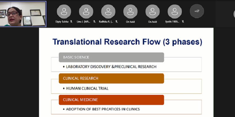 The lecture series 1 on “Translation Research: Overview” was delivered by Dr Anice George, Professor & Head of Research & Collaboration, Dept. of Child Health Nursing, Manipal College of Nursing, Manipal Academy of Higher Education, Manipal, India held on 1st March 2022 between 4.00 to 5.00 pm (IST). She gave a brief overview of translational research its meaning, definition, phases, and implementation process. Furthermore, she enlightened that translation research is the need of the hour which could help the health care professionals to conduct meaningful and applicable research that could result in quick and efficient translation of research into clinical practice for benefit of the patient care.