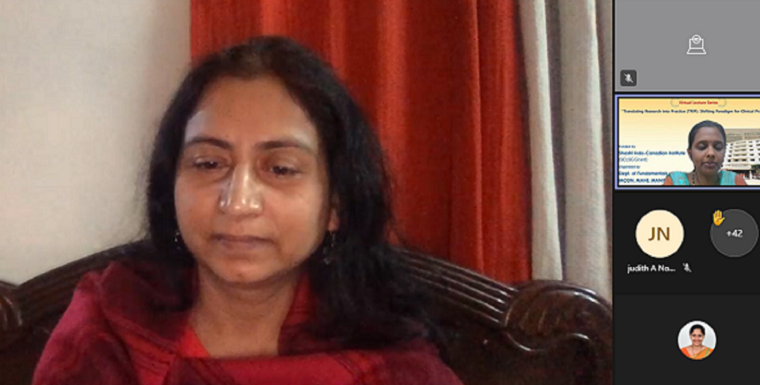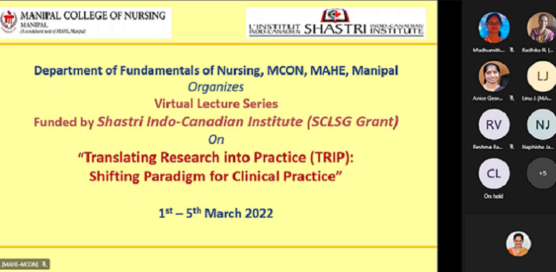 The Department of Fundamentals of Nursing, Manipal College of Nursing, Manipal Academy of Higher Education (MAHE), Manipal organized 5 days Virtual Lecture Series on “Translating Research into Practice (TRIP): Shifting Paradigm for Clinical Practice. This was funded by Shastri Indo-Canadian Institute (SCLS Grant)”. The inaugural program of this 5-day virtual lecture series was held on 1st March 2022 between 3.30 – 4.00 pm followed by the first-day session. Dr Prachi Kaul, Director, Shastri Indo-Canadian Institute, New Delhi, the Chief Guest for the programme addressed the participants during the inaugural program. The lecture series aimed to emphasize the efficient translation of research into clinical practice for the benefit of patient care by enhancing the knowledge on Translational Research its processes, models, challenges, and strategies.