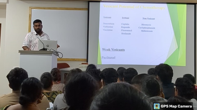 An Effective Alumni Engagement Guest Lecture was arranged by Manipal School of Nursing MCON, MAHE, Manipal on “Safety practices while handling chemotherapeutic drugs" for 3rd year GNM students on January 29, 2025. The resource person was Mr Siraj Salim Shaikh, an alumna of MSON, MCON, MAHE, Manipal, Diploma(N) batch (2014-2018). He explained the classification of chemotherapeutic drugs, preparation, and precautions to be taken while handling chemotherapeutic and vesicant drugs. There was active interaction between the students and the resource person, which led to a good learning experience. A total of 67 participants (GNM students and staff nurses of Paediatric Haemato-oncology) attended the session. Organizing interactions with experts in the field and preparing the student nurses for future healthcare services aligns with the Sustainable Development Goals, 4: Quality education.