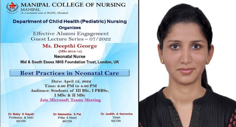 Department of Child Health Nursing, Manipal College of Nursing, Manipal Academy of Higher Education, Manipal organized an Alumni Guest Lecture on “Best Practices in Neonatal Care” on April 13, 2022, between 03.00 pm & 04.00 pm for undergraduate and postgraduate nursing students through Microsoft Team Platform. Ms Deepti George, Neonatal Nurse, Mid & South Essex NHS Foundation Trust, London, UK and alumna (MSc Graduate 2012-2014 batch) of MCON, Manipal was the speaker for the session. She discussed the various aspects of neonatal care including care during the first hour of life (golden hour), transitional care and developmental supportive care. She also emphasized the importance of family-centred care and family integrated care, which facilitates the empowerment of parents in the continued care of the neonate. Ms Deepti shared her experience of taking care of neonates and applying evidence-based practices in her workplace in the UK.