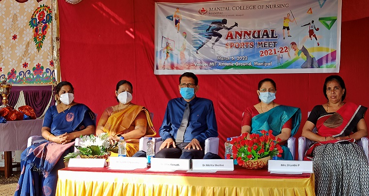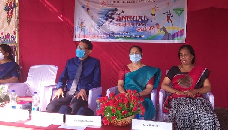 The Annual sports meet of Manipal College of Nursing, MAHE was held on Saturday 05th March 2022, with great passion and enthusiasm. The students were grouped into four groups namely Topaz, Ruby, Sapphire and Emerald. The inauguration began at 8.30 am in MIT Athletic Ground. Dr Judith A Noronha, Dean, MCON welcomed and introduced the Chief Guest Dr Ullas Kamath, Dean, Melaka Manipal Medical College, MAHE, Manipal to the gathering. All four groups marched coupled with thrilling music by the band of T A Pai English Medium High School, Kunjibettu, Udupi. The chief guest took the salute of the impressive march past of the students. The college flag was held by the student sports chairperson Ms Tenzin Dekhyi and led all the four march past groups. The students entered into the spirit of the occasion in a grand way with the oath being administered by the student sports chairperson. The chief guest addressed the gathering emphasizing the prominence of sports in life and declared the 31st MCON Annual Sports Meet open. Five of the best athletes of MCON took part in the lamp lighting ceremony. The best march past trophy was awarded to the group Emerald based on the evaluation by the judges. Dr Melita Sheilini, faculty sports advisor, MCON proposed the vote of thanks for the inaugural program.