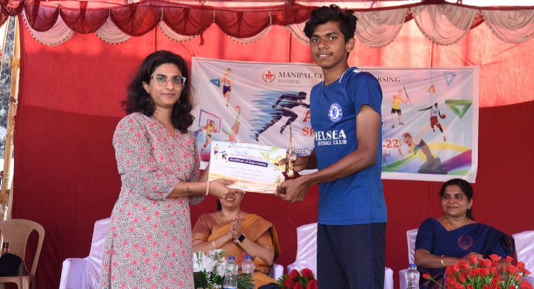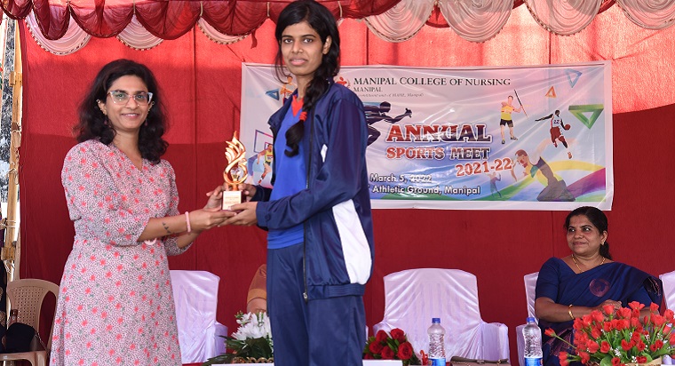 The valedictory program was conducted at 4 pm. Dr Tessy Treesa Jose, Associate Dean, MCON welcomed and introduced the chief guest Dr Shobha M Erappa, Joint Secretary, Sports Council, MAHE to the gathering. Chief Guest in her address emphasized the importance of determination and the positive mindset which is required for the success of any activity. She narrated her success story of the adventure race of Asia series in 20hrs that she has completed recently which actually was a booster for many of the students. The overview of the sports activities of 2021-22 was briefed by Ms Tenzin Dekhyi the student Sports Chairperson. The individual championship was awarded to Mr Joel Johnson, 1st year BSc (N) student from Topaz group and Ms Swidal Mendonca, 4th year BSc(N) student from Sapphire group. The overall championship was awarded to the group Emerald. Mrs Sweety J Fernandes, faculty sports co-advisor, MCON delivered the vote of thanks to the gathering. The event successfully ended at 5 pm with the National Anthem sung by the entire audience.