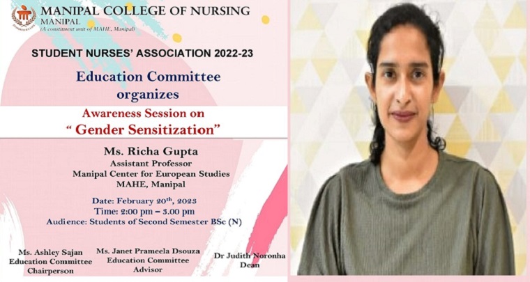 Ending all discrimination against women and girls is not only a basic human right, but it's also crucial for a sustainable future, it's proven that empowering women and girls helps economic growth and development. UNDP has made gender equality central to its work. Keeping one of the most important sustainable development goals in mind, the Education Committee of SNA organized an awareness session on the topic “GENDER SENSITIZATION” on the 20th of February 2023 between 2.00 and 3.00 pm. The resource person for the event was Ms. Richa Gupta, Asst. Professor, Manipal Centre for European Studies, MAHE, Manipal. She spoke on how men and women are treated in different societies, the stereotypes we follow, the importance of gender sensitization, and the role of inclusive communication in workplaces. A total of 130 students from the Second Semester BSc Nursing participated and benefitted from the session.