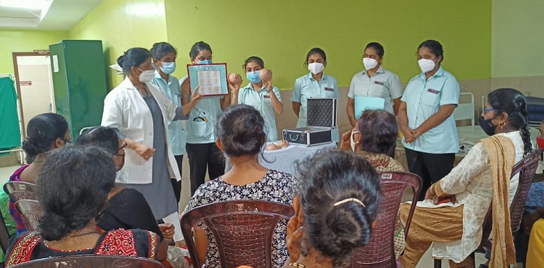 Globally, breast cancer awareness month remains despite the seemingly endless Coronavirus crisis. To create awareness among women, as part of Bharath ka Amruth Mahotsav activity, the Health Education Committee of the Student Nurses Association (SNA) - 2021 of Manipal College of Nursing, MAHE, Manipal, organized an awareness program on Breast cancer between 10.30 am to 12 noon on 9th October 2021 for the mothers and family members of antenatal and postnatal clients admitted in Women and Child health block of Kasturba Hospital, Manipal. The sessions were delivered by Health education committee representatives, Ms Levia Marina Lobo, Ms Shetty Swathi, Ms Nikshitha, Ms Jhanavi Crystal and Ms Aleena Jossy through discussion and demonstration. They said about the meaning, causes, signs and symptoms of breast cancer, steps of breast self-examination, myths and facts, and prevention and management. Students also emphasized on early detection by self-breast examination and regular screening and stressed about lifestyle modification to prevent breast cancer and promote optimum health. This program was coordinated by health education committee chairperson Ms Levia Marina Lobo, IV year BSc Nursing and Shetty Swathy, II year PBBSC Nursing, guided and supported by advisor Dr Yashoda Sathish, and co-advisor, Ms Prathibha Kamath, Assistant Professors, MCON, MAHE Manipal. All the sessions were informative. A total number of 20 participants benefitted from the program and it was well appreciated by them.
