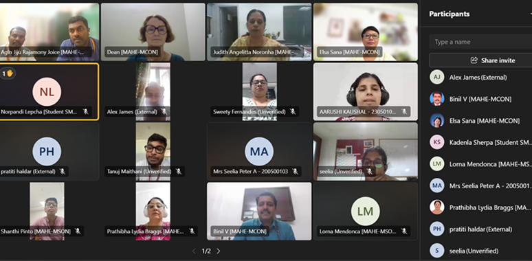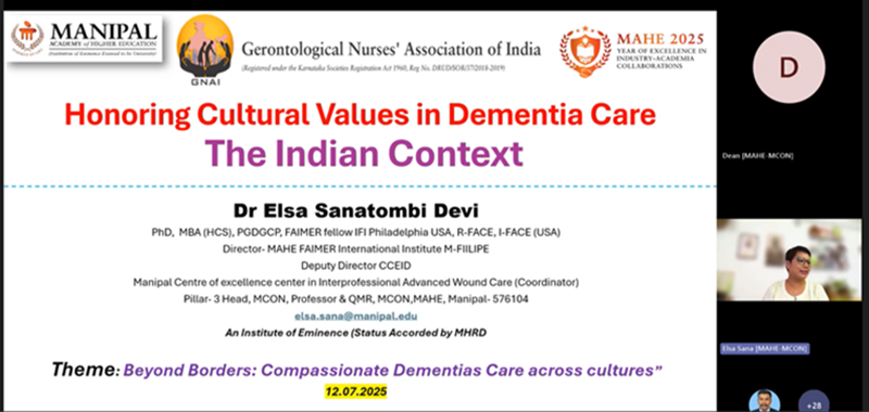 An Indo-UK virtual session for healthcare professionals was held on 12th July 2025, focusing on the realities of dementia care. Dr. Toni Bewley, Principal Fellow and National Fellow of Higher Education at Edge Hill University, UK, spoke on building compassionate global partnerships in dementia care. Dr. Elsa Sanatombi, Professor and President of the National Gerontological Association of India, presented insights on honoring cultural values in dementia care. Dr. Judith A. Noronha, Dean of Manipal College of Nursing, highlighted the importance of delivering dignified and quality care to the elderly, emphasizing that compassionate and personalized care is essential. The event saw participation from 34 faculty members and students across India. Co-conveners Dr. Anil Raj and Mr. Agin Jiju coordinated the session, with Dr. Anil advocating for active association membership to foster collaborative research in elder care. The program was jointly hosted by Pillar 3: Expanding Reach and Internationalization, Manipal College of Nursing, MAHE Manipal, and the National Gerontological Association of India. SDGs 3 & 4 were considered towards quality education and the elderly’s health and wellbeing.