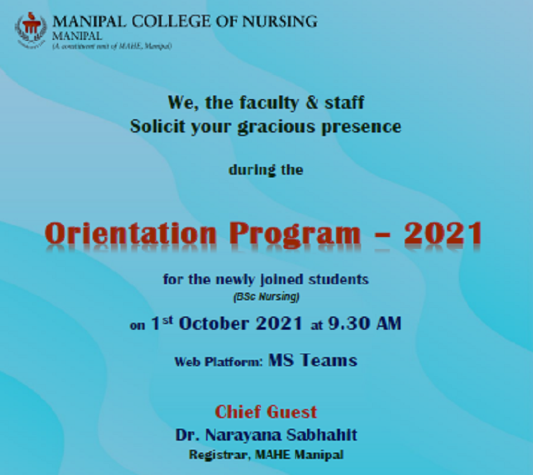 Student Induction Program (SIP) – ‘Deeksharambh’ for students admitted to the first year BSc Nursing course, for the academic year 2021-22, offered by Manipal College of Nursing (MCON), MAHE, Manipal was conducted from 1st to 9th October 2021 through Microsoft Teams web platform. Guest Lectures on various topics were conducted by various departments of Manipal Academy of Higher Education (MAHE) and MCON to induct the students to the overall activities to be instated in their due course of stay at Manipal.