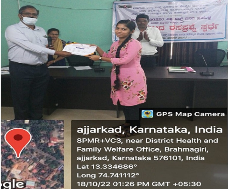 As part of World AIDS Day 2022, the District AIDS prevention and control unit, Udupi organized a district-level quiz competition on 18/10/2022 at Ajjarkad, Udupi. Two third-year BSc Nursing students, Ms. Ina Gladsin Alva and Ms. Jessica Rodrigues participated in the competition. Among 30 contestants from various institutions of the Udupi district, Ms. Ina Gladsin Alva secured first place. She will be further representing the district in the state-level competition.