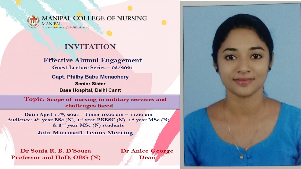Department of Obstetrics and Gynaecological Nursing, Manipal College of Nursing, Manipal organized an Effective Alumni Engagement Guest Lecture on "Scope of nursing in military services and challenges faced" on 17 April 2021 between 10.00 am & 11.00 am for I and II year MSc Nursing students and I year PBBSc nursing and IV year BSc Nursing students through Microsoft Teams Platform. Capt. Philby Babu Menachery MSc (N) 2013-2015 Batch alumnus, currently working as Nursing Officer, Base Hospital Delhi Cantt., New Delhi, India spoke on the topic. She briefed on Military Nursing, how one can join Military Nursing Services (MNS), the role of nurses in MNS, job responsibilities at different levels for nurses as per their designation, special benefits available to the nurses, activities which are prohibited and challenges faced, and also briefed on some of the carrier opportunities available. A total of 32 participants including students and faculty members of the college attended the session.