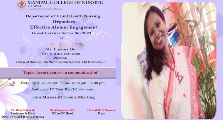 Department of Child Health Nursing, Manipal College of Nursing Manipal has organized an alumni guest lecture on the topic “Assertiveness in communication” on 21 April 2023 between 3.00 pm & 4.00 pm. Ms.Upama De, Principal, College of Nursing, Tata main hospital, Tata Steel Ltd. Jamshedpur {MSc(N) 2004-2006 batch} discussed the process of communication. She highlighted the barriers to communication and how to be assertive in clinical settings. A total of 75 participants including faculty members and students from 4th year BSc(N) attended the session.