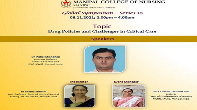 Global Symposium Series –10 on ‘Drug Policies and Challenges in Critical Care’ was organized by Team- Expanding Reach and Internationalization, Manipal College of Nursing, MAHE, Manipal, on November 6, 2021, from 2 pm to 4 pm.